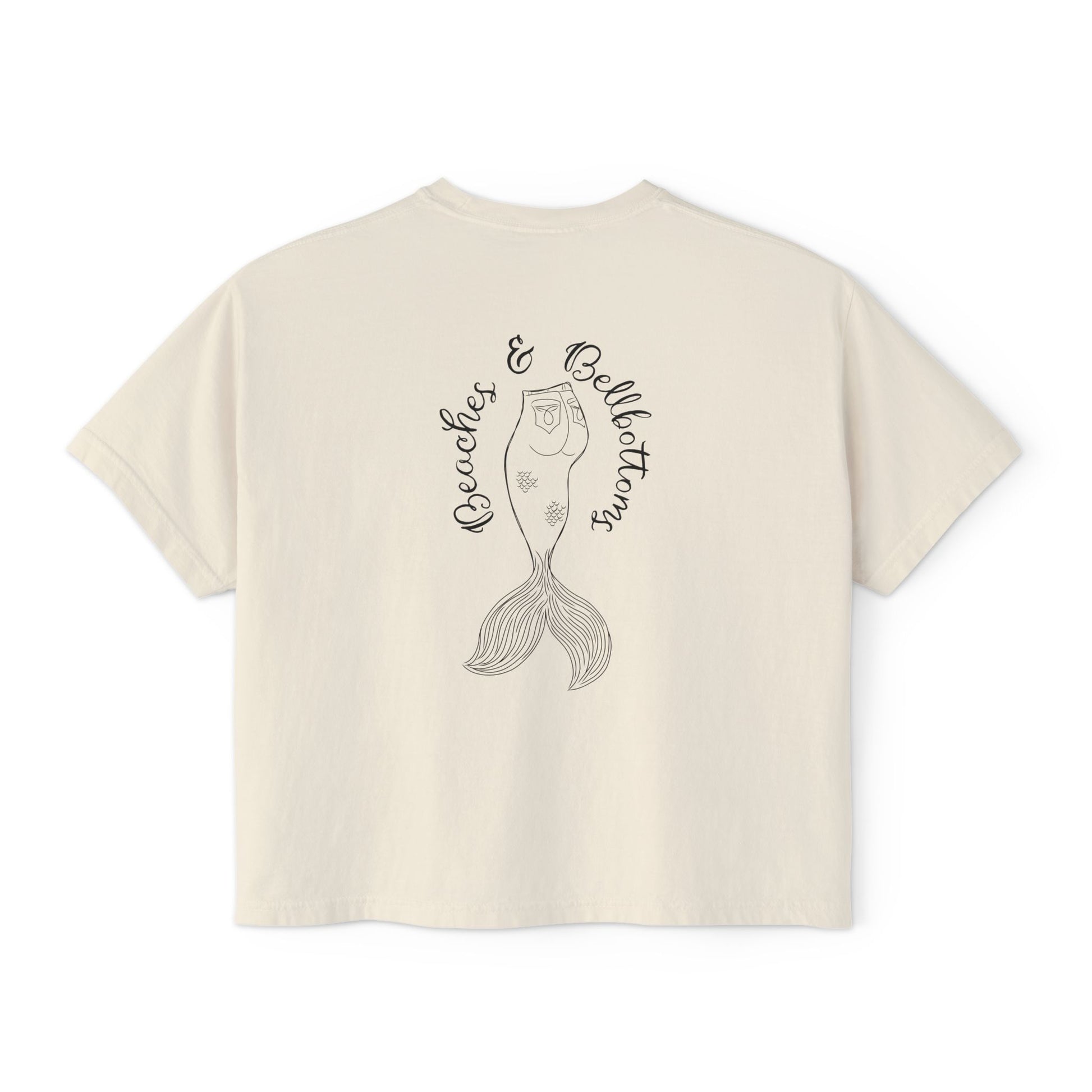 Beaches & Bellbottoms Boxy Tee — Women's Relaxed Crop T‑Shirt with Palm & Mermaid Art